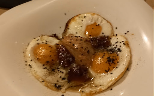 Huevos camperos a la brasa con mermelada de higos y foie: Esperábamos un plato más potente. No se notaba mucho que los huevos estuvieran hechos a la brasa. El foie estaba bien representado en cantidad, pero al igual que en otros platos, el sabor se perdía un poco. Los huevos estaban cocinados en su punto y la yema líquida en la justa medida.