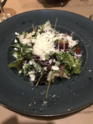 De primero como siempre que vengo, una ensalada con queso. Está perfectamente aliñada, con una vinagreta que potencia los sabores de la propia ensalada. Muy rica. De segundo, provolone sin carne. Está en el punto de sal perfecto, cocción más que perfecta y cantidad generosa. Viene acompañada de fingers de pan de pizza especiados, un espectáculo. Por último, una pizza, la selecta. Compuesta por rúcula, cherries y burrata cremosa. Muy buena la verdad. Para mi gusto, le faltaba un poco de sal esta vez, pero en general, genial.