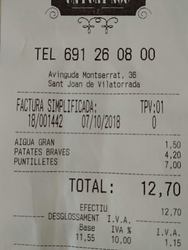 Read moreEstabliment discret en un local petit amb una terrasseta discreta situat al carrer principal de Sant Joan de Vilatorrada. Te un ambient molt humil i senzill, i ofereix un tracte en la mateixa línia, molt familiar, transparent i sense parafernàlies. La seva carta està formada per les tapes típiques, que saben preparar bé, amb quantitats generoses i uns preus més que correctes. Els caps de setmana tenen mes disponibilitat de varietat ja que hi ha alguns tipus de plats, com els de marisc o peix dels que no tenen disponibilitat entre setmana. La meva experiència va ser molt bona, i penso que el que s'oferia era el mateix que es pretenia oferir, senzillesa i ambient d'estar per casa. Molt...