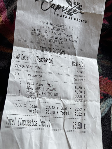 Lovely location, perfect for watching the world go by in the calm of Sant Josep. Open front outdoor terrace, clean modern interior, friendly staff, the most delicious assortment of sweet & savoury pastries, homemade quiches & fresh cakes to view on the glass counter, its hard to choose! Fresh natural juices, really good Coffee, healthy egg / avocado / salmon breakfast options, soya & nut milks available. Only criticism is that we ordered the 'pancakes' and they came out as just 1 small one? We expected at least 2 or 3 as a portion. It was delicious but more than 1 should be served. Other than that its a great breakfast spot you should visit soon, I guarantee you will...