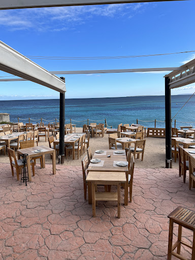 Upon entering, the hospitality begins immediately with a welcoming glass of cava and an amuse-bouche, hinting at the culinary delights to follow. The restaurant offers a variety of seating options, each with its unique appeal. The sandy terrace, closest to the DJ decks, invites diners to enjoy their meal with their feet in the sand, offering the best views of the beach and the Mediterranean. In contrast, the raised wooden dining terrace provides a more secluded setting, away from the DJ.