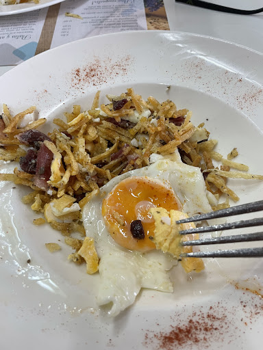 Después vienen los huevos fritos con patatas: adjunto foto porque me parece una vergüenza. A no ser que el comensal te pida el huevo vuelta y vuelta unos huevos estrellados deben llevar huevo con yema. De la naranja, de la que explotas y baña los huevos con patatas para hacerlo más jugoso. Que se les rompa un huevo al cocinar y te los sirvan completamente hecho me parece un descuido tremendo y una falta de interés horrible por parte del personal de cocina. Me comí los huevos com paptatas mas secos que había probado en mucho tiempo. Por no hablar que sabor a fruta era completamente inexistente.