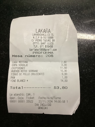 This was our third visit to LaKaña during our two week holiday on the island and likely won’t be our last before we fly home! We are blown away by the amazing quality of the food, along with the very efficient and friendly service from all the staff, particularly Marcos. As far as fish goes, this is without question the best we have ever had and they offer a great range of meat dishes, too. The fresh mussels (from Mahón) were simply amazing, both in taste, texture and size. In fact, they literally melted in your mouth! All the desserts are homemade and I can thoroughly recommend the local ‘pudding’. We have no hesitation in recommending LaKaña wholeheartedly to anyone on the island and it will certainly be worth a visit. Do try to book in advance as it is clearly very popular with the locals (always a good sign!) Well done to all concerned in your recent opening of a real hidden gem and best wishes for every future success, which I am sure you will have if you continue what you are...