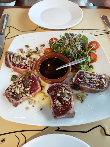 Waitress was good. Waiter clearly in training. Service a bit slow. Way too many wines on list. This is a small restaurant in small resort. Other restaurants have it right. Veg that comes with fish is rock hard. Carrots need some cooking before griddling Tuna salad starter is meal on it's own. Fish is presented with head on, beware if that isn't how you like it. Overall a bit disappointed. Bar next door is great for pre or post...