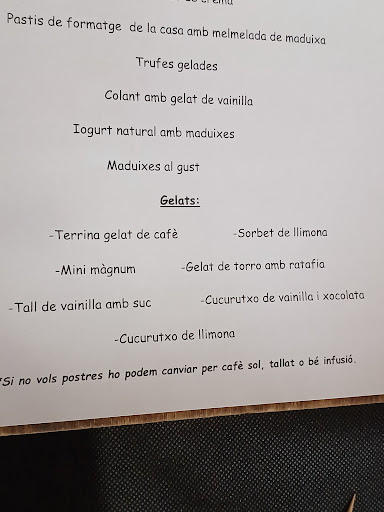 Read moreHemos ido esta mañana para desayunar y el trato ha sido nefasto. Una vez sentados mi pareja no HA COMIDO NADA y le ha quitado el mantel con los cubiertos de muy malas formas porque decía que todos los de la mesa tenían que comer y que no se podía compartir comida. ¿Y que pasa si no quiere comer? Según dice que hay que avisarle antes de sentarte. Esto no pasa en ningún negocio. Podría llegarlo a entender en un buffet, una calçotada...etc. Y pagar por un plus de 2 euros por servicio a consecuencia de que exista personas que coman poco para desayunar o no quieran comer? Venga ya!!! Perdone pero tiene una manera de hacer negocio malísima. En los tiempos en los que corremos no nos podemos poner exquisitos. Se intenta atraer a la clientela, fidelizar a la gente sea del pueblo o personas que pasan que van hacer senderismo, deporte o visitas a los alrededores. Yo también trabajo de cara el público y se lo que conlleva y no por eso cuando te hablan con educación, hablo de forma tan prepotente y altanera. Y respecto a su manera de comentar que si no es así no puede sacar el negocio adelante? Miles de negocios están igual que usted y no por eso tratan de esa manera. Y pagarían porque la gente fuera más a sus locales aunque sea para consumir un café. Le recuerdo que con el buen trato, el cliente vuelve y lo importante no es tanto lo que se gaste porque alomejor el primer día se gasta 1€ pero el siguiente, siguiente lo sigue frecuentando y le encanta el ambiente y el trato que se gasta más. Íbamos a volver, ya que somos propensos por pasar por la zona pero evidentemente no lo haremos. En conclusión, no lo recomiendo. Soy de las que piensa que hay que gastar y potenciar el consumismo en nuestra restauración española haciendo piña entre todos porque hay que ayudar...