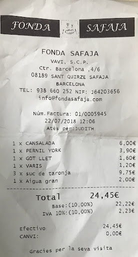 Read moreHemos ido a comer, porque había leído acerca de la buena cocina. Conseguir la carta, ha sido complicado, solo la tenían en catalán, idioma que respeto, por lo que hemos necesitado esperar, otra vez, a que la señora que compartía la atención a las 5 mesas ocupadas, nos ayudará a entender que era cada plato. Esto con ser algo absurdo, no ha sido lo peor, lo más desagradable, ha sido que después de solicitar la cuenta para pagar y marcharnos, han pasado casi 40' y el encargado de elaborarla se había ausentado, para pasear al perro de otra persona y tardaría un poco, no podíamos creerlo!!! La señora que estaba allí, ya no había más clientes, entendía que nos molestará esa falta de atención, pero ha salido a buscarlo y nos informado que le quedaban unos minutos. Cuando por fin ha vuelto, un simple "disculpen" en voz baja y sin mirarnos, ha sido la explicación. Obviamente, ya ni recordábamos como estaban los platos que hemos tomado, con el mal cuerpo que teníamos. Por supuesto no...