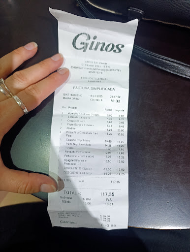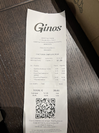 Read moreMuy desagradable experiencia, GINOS San Vicente del Raspeig. Llego a cenar sobre las 22:30Hs. Pido dos bebidas y dos pizzas, sobre las 22:50 me traen las pizzas, maza fina la cual si bien yo no especifiqué que masa quería tampoco la camarera me dio la opción, otra camarera que pasó por allí escuchó el comentario que realice de que la masa fina no era en realidad de mi agrado. Preguntó si estaba todo bien a lo cual le dije que no sabía que la masa era así de fina y me dijo que tenían la otra opción si el cliente lo solicitaba. Y se ofreció a cambiarme la pizza le dije que no, que no era la que me apetecía pero que me la quedaba. Nuevamente me dice que la repite sin problemas. A lo que acedo. Cuando retira la pizza y se la lleva y pide en pizzería que repitan la pizza, el pizzero de turno realiza gestos y mala cara por tener que repetir la pizza. Por lo cual regresa la camera a la mesa y le digo que no se preocupe que no repita la pizza si lo hace de mala gana y me responde que no que la repite, que los gestos son por que ya estaba recogiendo y cerrando cocina. Le vuelvo a decir que no la repita que no pasa nada. Y al final la repite, después me trae lo que enseñó en las fotos. Una pizza quemada y prácticamente sin ingredientes ya que los pocos que tenía estaban quemados. Fatal la experiencia, no lo recomiendo y si a la empresa o franquicia, les interesa mi experiencia estoy abierto a la comunicación. Ya que puedo entender por qué en un local así solo estábamos 3 mesas. Si el trato que recibí lo hacen periódicamente, el cierre será pronto. Juzguen por las fotos si este es el producto que...