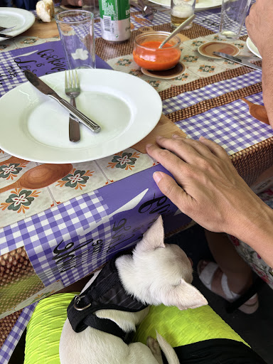 De PETFRIENDLY NADA. Busqué por internet un sitio para comer 6 personas y que permitieran mascotas. Bueno, pues entre otros me salió Casa Lito, (ya habíamos estado en otras ocasiones y muy bien, todo hay que decirlo). Así que nos vamos para allí. 👨🍳Un chico muy amable nos atiende y le comentamos que llevamos un chihuagua🐶 (es mini de 1,5 kilos) y nos llevan a la parte de abajo al aire libre de tierra y picón y mesa y sillas de propaganda. Hasta ahí todo bien, o casi( las sillas y mesas llenas de tierra: no pasa nada, las limpiamos nosotros con servilletas). Cogemos una silla a mayores también toda llena de tierra y lo ponemos ahí, separado de la mesa, ni un minuto. Desde donde está la silla no llega a la mesa ni dando un salto olímpico, pero luego, lo cojo y lo pongo en mi regazo, hasta que llega una camarera y nos dice que el perro no puede estar en mis muslos: órdenes de la dueña según la camarera. Y con cara de cuadros en milésimas de segundo pienso: si lo tengo en mis muslos está controlado. No hay nadie. Si lo dejo en la tierra igual levanta la pata y si hay algo seguro es que se haría un asco. Así que nos levantamos y los camareros al marchar no entendían por qué nos ibamos. Se lo tuvimos que explicar nosotros mismos y la dueña ni apareció ni dio la cara. Lo que pienso es que semejante percal para un perro de esas dimensiones. Una pena la verdad. Perdieron a unos clientes. Y tengo derecho a irme y no pagar por dejar el perro en un suelo de tierra, sin habilitar y lleno de plumas de los gallos y pajaritos que están situados a 20 metros de unas mesas y sillas llenas de tierra. AGUANTO PLUMAS, AGUANTO GATOS, AGUANTO MESAS Y SILLAS LLENAS DE TIERRA, pero lo que no aguanto es que tenga que PONER EL PERRO en ese SUELO, por ser antihigiénico ponerlo EN EL REGAZO. Si son petfriendly, elaboren un protocolo y a la entrada se lo explican a los clientes. Así pueden decidir si quedar o no. Tómense esto como una crítica constructiva, pero visto lo visto, ante los comentarios de la encargada, dueña o lo que sea, en facebook comenta que la camarera le dijo a esta señora que vio al perro con las patas delanteras sobre la mesa, cosa que Es MEnTIRA y viendo su actitud, dejo constancia de lo ocurrido. Dejo foto del perro en otro guachinche que muy amablemente nos atendieron y donde el perro no se movió de mi regazo y otra que demuestra lo felices que son los animales y lo amargadas que están...