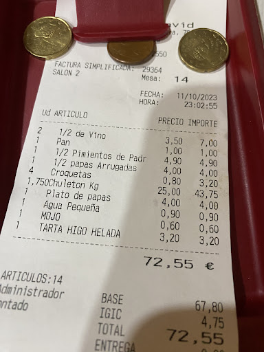 Read moreNos sentimos engañados. Fuimos dos. Pedimos medias raciones entre ellas de papas arrugás y queríamos cenar carne. Pedimos al camarero chuletón para dos, que por favor tuviera en cuenta que habíamos pedido entrantes. Nuestra sorpresa es que nos trae un chuletón de tamaño descomunal de un grosor de 4 dedos donde habrían comido 5 personas perfectamente. También una ración de patatas fritas que no habíamos pedido ya que teníamos papas arrugás y pensamos que venían con el chuletón pero luego en la cuenta se nos cobran. Cuando vemos la cuenta….su peso era de 1, 750kg…. Chuletón para dos... Obvio se quedo más de la mitad en el plato. Al decírselo al camarero, nos dice que su jefe corta el chuletón a ojo y es el corte que ha salido… entiendo que este señor era nuevo y que era el tercer chuletón que cortaba en su vida….porque si no, no me lo explico. En todos los años que hemos ido a la isla, es la primera vez que tenemos la sensación de engaño y por supuesto no volveremos ni recomendamos este sitio. Hay mejores guachinches...
