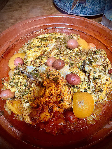 We had pre-ordered a Chicken Tagine for 6 people, and it was out of this world, totally delicious, incredible flavour from the preserved lemons and olives. Youssef explained to my British husband that the chicken is Halal, hence the tenderness. For starters we had Humus and an aubergine dip (Mutabal?). Also the chef Mustapha suggested a selection on empanadillas off the menu. Super fresh and Yummy!! The complimentary mint tea at the end was great too. We are definitely coming back to try their Cous-Cous. And excellent value for money!!! It came to less than €15 per head,...