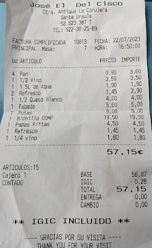 Read moreBuen vino, local agradable y buen trato. Pedimos una ración de cabrito frito y nos preguntó que mejor era pedir por trozos de carne; 4 ó 5 para cada uno, pues venga les pongo 5 trozos a cada uno. A la hora de pagar, dos raciones a 13 euros; 26 euros de precio por una bandejilla de cabrito frito. Total 41 euros, que debieron de ser suficientes con 28 euros. Se nos estropeó el almuerzo tan agradable. Pagamos sin discutir, y hasta...