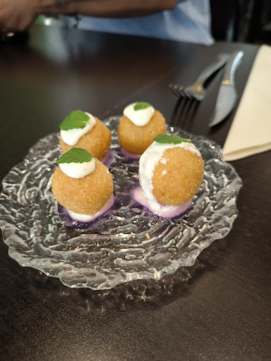Personal inmejorable y nos dejaron entrar con la perrita así que es un +10 ya. Es un local pequeño, las mesas están muy juntas y nos cuadró una mesa en la que gritaban mucho y otra en la que descuidaban al niño pequeño que se acercaba al perrito constantemente y no comimos del todo tranquilos. Nos guiamos un poco por las reseñas y por lo general salimos contentos, pedimos: Aperitivo de parte de la casa: unas croquetas de risotto y col lombarda que estaban muy buenas. Croquetas de gorgonzola: croquetones mejor dicho, bastante cremosas, solo vienen 4 pero el tamaño compensa. El sabor es potente y sabroso. Ensaladilla rusa: muy buen sabor. El único fallo, no viene acompañada por picos ni biscotes, sin embargo te los ofrecen... Pero para nuestra sorpresa, nos lo cobraron como un extra, cuando es algo que en todo plato de ensaladilla viene incluido. Wok de pollo: nos dijeron que era contundente, no nos pareció para tanto la cantidad, pero estaba bueno. Pica un pelín. Plato fuera de carta: era una mezcla de ceviche y ensalada de gambon, estaba muy bueno y fresquito. Venía acompañado de wan tun (eramos 4 y solo pusieron 2, por lo que pedimos un poco más... Y sorpresa, otro extra que nos cobraron). Cachopo: famosísimo y entendí por qué, estaba bastante bueno y aunque sea mucho más grueso que los habituales, no está para nada seco, es tierno y jugoso. Sin embargo tiene un potente sabor a trufa tanto en la salsa como en el interior, para quien no le guste. Además no lo acompañan con papas fritas ni nada. Tiramisú de pistacho: muy conseguido y rico, ya que a pesar del sabor a pistacho notas también el del café, cosa que en otros sitios falla a veces. Torrija con helado de maracuyá: muy rica y fresquita. En cuanto al precio, bueno a pesar de que la comida estuviera muy buena, las raciones eran bastante pequeñas para los precios de los platos, por lo que la relación calidad-cantidad-precio, algo...