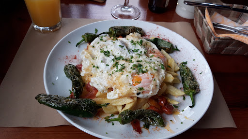 Food is fine. I wouldn't shout loudly about it though. We tried quite a few dishes: Tabla de quesos (cheese platter - they ran out of cheese, so we only had one kind), Langostinos crujientes (prawn fritters served with sweet and sour sauce, no doubt from an Asian supermarket), saquitos de morcilla (blood sausage fritters - a bit too dry), croquetas (the croquettes were probably the best dish), and huevos estrellados (eggs, chips, cured ham and chistorra sausage - tasty buy swimming in the oil from the chistorra). There wasn't a wide selection, and perhaps our selection wasn't ideal - too many fries...