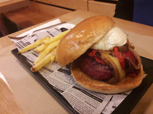 Read moreCena entre amigos no disfrutada. Por casuística tuvimos que reservar mesa para las 22:30. La reserva se hizo a través de Google y reservar a las 22:30 era posible. Nada más sentarnos, sin ni siquiera traernos la carta, ya nos advierten que no tardemos que van a cerrar la cocina. Nos sorprende pero somos rápidos en pedir, aunque los camareros se demoran mucho en venir a tomarnos nota. Pedimos unos nachos para compartir y unas hamburguesas. Los nachos no estaban mal, pero la cantidad para nuestro parecer era muy poca. Sin haber acabado la ración, viene una camarera y retira los nachos sin preguntar. Le avisamos que por favor no los retire aún, pero está tan concentrada en recoger todo que no nos escucha. Nos sirven las hamburguesas y se ponen a barrer y fregar parte de la sala. Si ya no nos había quedado claro, ya nos dejan claro que tienen prisa por cerrar. La hamburguesa Divina con queso de cabra y mermelada de frutos rojos, todo un acierto. Estaba buena. Íbamos acabando y en cuanto acabábamos, isofacto, venían a retirar las bandejas sin preguntar si habíamos acabado. En poco más de una hora ya estábamos fuera, contrariados con la presión de la prisa que desde el primer momento nos han ejercido. Si no queréis clientes a esas horas, no dejéis reservar tan tarde. Lamentablemente,...