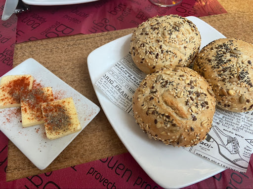 Read moreUna gran decepción, vinimos recomendados, la ensalada de salmón bien pero sin ser especial, un bacalo con mojo, tomate, patatas panaderas y cebolla bastante aceptable y rico, un entrecot de la tierra muy flojo es una carne sin sabor, nos habían comentado q la ternera en la Palma era buena y hemos comprobado q no es así, nada recomendable. Los postres normalitos y la copa de ron miel lamentable, q te sirvan una copa cargada de hielo y comienzen a rellenar con un hilo caiendo de la botella dejando el ron por la mitad del hielo es una decepción tremenda, le pedimos un poco más, por favor y fue un chorrito más lo q echaron una decepción tremenda, sinceramente ni lo recomendaremos ni volveremos más. El patio interior es un sitio agradable para comer, pero al menos con las copas deberían estirarse un poquito más. En la carta de vino solo había un rosado y encima no lo tenían, de excusa nos dicen q no es bueno pues no lo pongas en la carta y pon otro. Que no,...