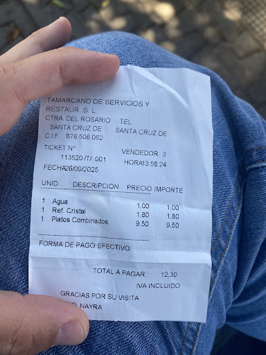 Read moreBocadillos rácanos a precios de restaurante. Pedi un bocadillo de pollo y me ofrecieron uno de pata blanco y tomate dije bueno vale y me trajeron uno de pata grasienta con queso amarillo. La camarera repartió cambio en monedas a otro cliente y sin lavarse las manos nos vino a poner la comida en la mesa. Mi mujer pidió un bocadillo de machada y queso. El pan poco más grande que una pulga con dos lonchas de queso que se...