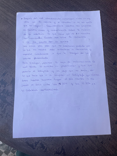 Se ha comprado un Groupon de un brunch en la cafetería KonKalma en Santa Cruz. En primer lugar, la camarera nos hizo esperar cinco minutos para sentarnos en mesa, mientras que otros clientes entraban y se sentaban. Seguidamente tardó al menos media hora en tomar nota, todo esto, después de levantarme de la mesa para decirle que todavía no había tomado nota y cuando salía adelante mía me dijo que tenía gente delante y las personas las que sirvió habían llegado 10 minutos después de nosotras. Cuando viene a tomarnos comanda, le preguntamos por el tamaño del croissant y se negó a enseñarnos e incluso gesticular el tamaño de este diciendo que no lo podía decir, porque era un croissant amorfo luego se le dijo que le iba a solicitar la hoja de reclamaciones y nos dijo que nos devolvería el bono y que no nos atendería si le pedíamos la hoja de reclamaciones. Después del mal atendimiento comienzan risas en voz alta en la cocina y si no les gusta que se vayan. Seguidamente, nosotras nos quejamos en nuestra mesa y casualmente suben la música en la cafetería, lo que hace que no se escuche los murmullos de la cocina. cuando no sirve la camarera, la cual no ha querido dar su nombre nos sirve otra bebida que no habíamos pedido, por lo que mi madre debe levantarse a devolverla y esperar nuevamente a que le traigan la bebida demandada. Para finalizar pedimos la hoja de reclamaciones, la cual tarda 10 minutos en proporcionarse y tuve que pedirle un bolígrafo. La camarera no nos dió ningún bolígrafo deseando que no tenía por lo que tuve que ir a comprar un bolígrafo yo misma. Éstos hechos tuvieron lugar el día martes 4 de junio de 2024 entre las 10:55 y las 12:30 en la cafetería Konkalma. después de escribir esta hoja de reclamaciones, la camarera saca un bolígrafo y responde sobre la misma hoja añadiendo su firma y su correspondiente sello, además de rayar el resto del folio. En la versión de la camarera dice que llevamos a las 11:10. Cuando realmente tenemos fotos que corroboran que estábamos sentadas en la mesa a las 11:00 ya que teníamos una reserva y y el desayuno fue servido a las 12, la hoja de reclamaciones se hizo a las 12 30. Lo que se le reclama es la devolución del dinero debido a las largas esperas y la mala actitud y atendimiento por parte de la camarera (que minutos mas tarde oímos a unos clientes habituales llamarla por el...