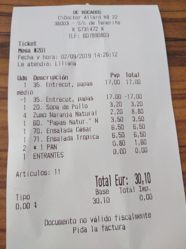 We followed the feedbacks in Google and visited De Bocados during the launch time. There was almost no people but the first dish (french fried) we got in 30 minutes after order. Then we awaited for salads about 20 minutes. The salads was not good. The sauce was disgusting. It was more look likes a junkfood. I found a stick from apple directly in my plate of salad. Totally we had been waiting for 55 minutes and refused the second course (it was only one position in bill because waiteress forgot about one more). Nobody informed us and appologised. Do not...