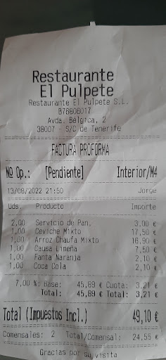 Read moreAyer 12 de junio, acudí con mi madre a almorzar al Rte. “El Pulpete” . Quiero ratificar y confirmar, que es el Restaurante Peruano más genuino que existe hoy por hoy, en Tenerife. Como conocedor del Perú y medio Peruano/Canario que soy. Ayer experimenté una sensación extraordinaria. Pues increíblemente me daba la sensación que me encontraba almorzando, en unos de los mejores restaurantes peruanos del barrio de Miraflores en Lima. Pero no; resulta que era el mejor restaurante Peruano abierto en Santa cruz de Tenerife, hasta el momento. Gran y completa variedad de absolutamente todos los platos de la cocina tradicional peruana, aparte de otros muchísimos platos más de la cocina española e internacional. Disfrutando al mismo tiempo de un ambiente, tranquilo, relajado y acogedor. Recibiendo como siempre, las mejores atenciones de la SRTA. ANAIS, la cual presume de ser una mesera de altísima calidad y profesionalismo. Muy competente en todas sus funciones. Y por supuesto del señor Willy y todo su gran equipo. Todos estos aspectos, complementos y cualidades, hacen que sea la opción de primera elección como Restaurante Peruano en Tenerife. Les doy las felicidades una vez más a todo el equipo. Y animo a todos mis compatriotas canarios, a que se den la oportunidad de disfrutar y degustar las maravillas de la cocina peruana. Que sepan que el lugar acertado es: “...