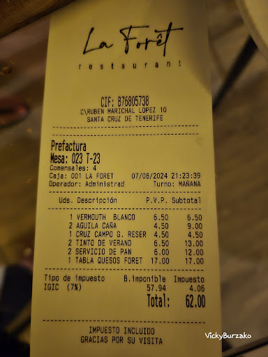 Read moreEl lugar con vistas a Sta Cruz, el local precioso y exquisiteces en cada plato! Vale la pena regalárselo de vez en cuando teniendo en cuenta el precio bastante caro pero se nota la elaboración minuciosa de la comida y el sitio es espectacular! Como críticas constructivas como para ponerle pegas a algo y conociendo el sector de la hostelería, podrían añadir más guarnición en los platos (salsas más contundentes en relación a la cantidad de pescado y más verduras o lo que lleve cada plato porque te quedas un poco corto), y el servicio tendría que ser más impoluto en ese tipo de restaurante. La camarera fue muy amable y no quiero perjudicarla ni mucho menos con eso, simplemente por adecuar más el servicio al local y al precio. Tuvimos que levantarnos y recordarle que no nos habia traido primero una bebida y luego el café y luego hubo un error en la cuenta, nada grave y se rectifico, pero teniendo en cuenta que habia únicamente otra mesa de 2 y nosotros 2, no fue por sobrecarga de trabajo. Le faltó conocer a la perfección cada detalle de cada plato por muy nuevo que sea en la carta, eso tampoco tiene mucha importancia, pero si se le llena el restaurante y tiene que consultar a menudo pierde tiempo y se estresa más. Eso no quita de ninguna manera que tuvimos una muy buena experiencia en La Forêt y que sin lugar a dudas volveremos otro día importante a probar más delicias! Gracias por el...
