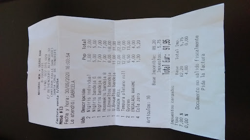 Read moreUna muy mala experiencia. Nos han estafado y robado dinero. La camarera que nos atendió, Gabriela, normal, pero a la hora de pedirle recomendación no supo decirnos porque no se sabía bien la carta. Las porciones son muy pequeñas y no muy buenas (sushi) las gyōzas estaban bastante bien. Al traernos los entrantes nos dijo la camarera, despejen la mesa porque viene muchísima comida ahora. Bien, pues éramos tres personas, tras las Gyōzas vino la comida de mis dos amigos y a mi me dejaron, literalmente, una hora esperando por 3 simples rolls. Éramos los únicos clientes en todo el restaurante, es inadmisible y para colmo, no estaba bueno. Salimos con hambre y fueron más de 90 euros de cuenta, flipábamos con lo caro que había sido para un sitio como ese. Le pedí el ticket a la camarera porque no me lo creía y se negaba a dármelo. 3 veces le tuve que insistir en que quería ver MI ticket. De verdad que la experiencia es para no volver. Después de haberme ido del local, vi que nos habían estafado. Es ilegal, y está recogido en el BOE no incluir impuestos en la carta ofrecida al comensal. Es ilegal poner que los impuestos no están incluídos, pues en este restaurante no indica nada de impuestos en la carta, por tanto, el precio que se ve, es el precio final... PUES NO, nos han metido luego otros 6 euros de impuestos extras. Es alucinante la poca vergüenza. Porque me di cuenta tarde y revisé el ticket porque seguía sin cuadrarme la cifra ya lejos del restaurante porque les hubiese caído una buena hoja de reclamaciones por estafar de esa manera a gente de vacaciones...