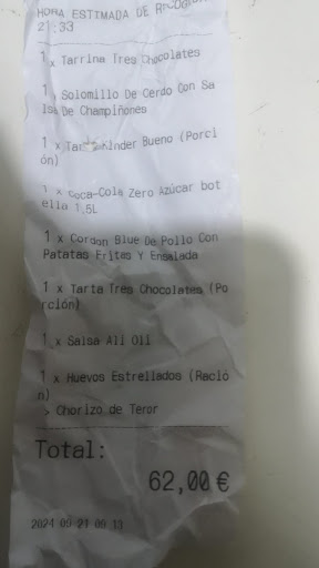 Read moreHoy hago un pedido que era para entregar a las dos y me lo trajeron a las tres idiez aparte de esta demora la comida estaba cruda apesar que le repetí que la quería bien hecha y por último me cobraron 8,50 por un pollo cuyo valor era 6,50 y me cobraron dos euros por el transporte viviendo muy cerca .Es decir por un pollo y unas papas fritas me cobraron catorce euros me parece caricimo y por mi parte perdieron unos cliente que éramos habituales. Pedimos hamburguesas normales hechas de carne del tipo Mercadona y me cobraron por cada hamburguesa 4,23€, cuando solo llevaba carne, un poco de ensalada y las salsas. El sitio más caro donde he comprado una hamburguesa En el día 28 de julio de 2024 pedimos un pollo y una ración de papa. Por traernos la comida a mi casa la cual está aproximadamente a dos kilómetros nis cobraron por el transporte 3.50€. es una auténtica estafa me parece un robo no recomiendo que pidan a domicilio. y esta es la forma en...