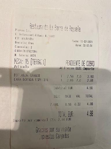 Read moreLamentable. Nos cobraron el agua del grifo. Mientras decidíamos que cenar pedimos la bebidas. Una cerveza y agua. Al volver, el camarero nos indicó que varios de los platos se habían terminado y no quedaba pan para tostas. Decidimos pedir la cuenta y marcharnos. Nuestra sorpresa fue que nos cobraban el agua. Agua de grifo en una botella de vermut reciclada. Al quejarnos, el camarero nos indicó que estaba filtrada. Solicitamos la hoja de reclamaciones, y no tenían, por lo que llamamos a la policía municipal, que solo tardo una hora en llegar. Por desgracia no podemos comprobar si han sido sancionados por algún motivo. Al final estás de vacaciones y ya perdimos una no he con eso y se libraron de que fuéramos al día siguiente al OMIC. Nota Agua potable de gran calidad y salubridad demostrada ? Cuando bebo de una botella precintada puedo tener eso. Una botella de vermut rellenada con agua de no sé dónde , no.