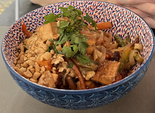 Read moreThe food here was more creative than the other vegan/vegetarian (this place is vegetarian) places we found in Santa Cruz. The menu was not mostly burgers, for a pleasant change. Unfortunately, the food could have been tastier. I had a salad dish with seared eggplant slices, pickled mushrooms, pimentos, some smoked cheese cubes and greens (I don’t remember the name of the dish). The eggplant slices were too tough and the salad needed some kind of oomph, zest, something was missing. The smoked cheese pieces were tasty. So, it was more or less OK, but not great. My spouse had the Thai wok dish that had noodles and some veggies and tofu and enjoyed it. I had a nice size cup of green tea with mint, and my spouse had an americano. The service was good. We ate outdoors, and the tables are set up on what is a narrow street that seems to have been turned into an outdoor eating area with umbrellas, but I wouldn’t call it pretty. The indoors was functional,...