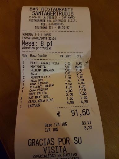 Al final, los montaditos, 2 greixonera, 2 cornetto, y 2 café caleta, más una botella grande de agua, una shandy y un tinto de verano, en total, 54€ Creo que está muy bien, para lo bien que...