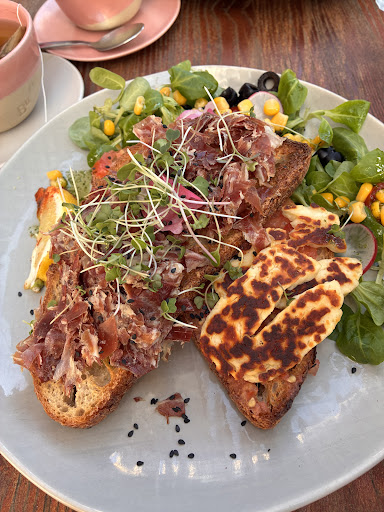 Have wanted to try this place since seeing friends come and it didn’t disappoint. Set on a beautiful little street right by the beach it’s perfect for a breakfast/brunch. The food offering is great and portions extremely generous and no expense spared with the salmon. We had the Iberico ham and halloumi dish and the naughty salmon. We wanted something sweet so ordered kids pancakes but it was really too much! Great selection of drinks etc too! Service was wonderful. Only thing that was funny was a little dog who lives upstairs kept barking/scratching at the door right by where I was sat but otherwise it didn’t deter from the...