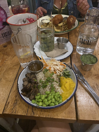 Read moreUpon my latest culinary escapade, I found myself at Project Social in Santa Eulalia, a gem on the roadside corner by the port carpark entrance. This vibrant spot, with its curbside dining area adorned with brightly painted chairs and upcycled tables, immediately enveloped me in its magical, welcoming embrace. Inside, the decor — an eclectic mix of rustic boho chic — exuded an unpretentious, cool vibe, promising good times. Egos and airs and graces to be left at the door - this was home from home.