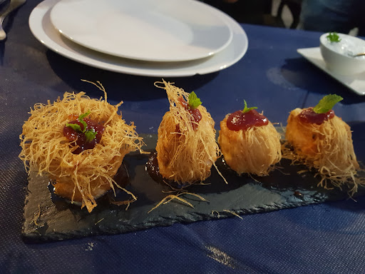 This restaurant is superb if you are looking for authentic and traditional dishes with a modern twist. The place was classically decorated with the blue & white of a coastal setting, with a high end feel. Service was impeccable 👌 our server (Nacho) was attentive, informative, helpful and extremely kind. You MUST try the red aoili and bread! We ate salmon balls and battered prawns to start; both were encased in a light nest which was super crispy. A complimentary dish of codfish croquettes; smooth, soft & creamy. The main dish was one of the specialties on the menu - red paella with prawns, crayfish & scallops. It was pure joy and tasted of the sea. Crunchy on the edges and oozy in the centre. Full bodied and a rapture of flavours. We accompanied this with a bottle of sumarroca nostrat (a white sauvignon blanc), very light, fresh and soft. The entire experience was superb from the moment we arrived to the second we left. If you are in the area we highly recommend. You will not be...