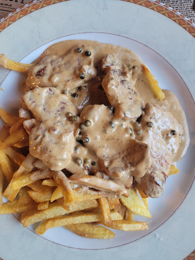 Como plato principal, el solomillo a la pimienta verde se lleva todos los aplausos. La carne, tierna y perfectamente cocinada, se deshace en la boca, y la salsa de pimienta verde eleva el plato a otro nivel. Esa mezcla cremosa, con el toque especiado de la pimienta, combinada con las crujientes patatas fritas caseras, te deja con un sabor que recordarás por mucho tiempo.
