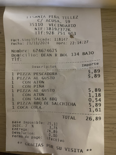 Read moreSiempre eh comprado las pizzas aquí, por que cuando erais novedad y empezaron, las pizzas tenia mejor calidad y para colmo mas baratas !! Ahora después de que quitaran el servicio en el local y hallan estado ahorrandose de todo y solo para llevar .. no puedes pagar con tarjeta y encima la masa también la cambiaron, esta masa de ahora parece hojaldre y se espisca toda la pizza encima me la traen quemada y también se cuando las hacen al trancado !! En definitiva… no se asemeja a cuando abrieron !!! Ahora más caras y menos calidad !!! Miren...