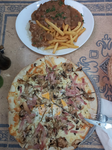 Los pimientos de padrón no tenían buen aspecto, como se puede ver en la foto, lo que afectó la impresión inicial del plato. La pizza tropical estaba bien en cuanto a sabor, pero sin destacar. En cuanto a los calamares saharianos, aunque estaban correctamente cocinados, las papas fritas congeladas que los acompañaban no parecieron estar a la altura del precio del plato.