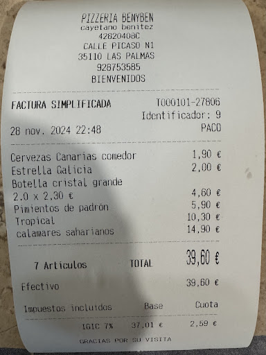 Read moreVisitamos Pizzería BenyBen y nuestra experiencia fue regular. Pedimos varios platos: pimientos de padrón, una pizza tropical y calamares saharianos, acompañados de una pequeña ensalada y papas fritas congeladas.