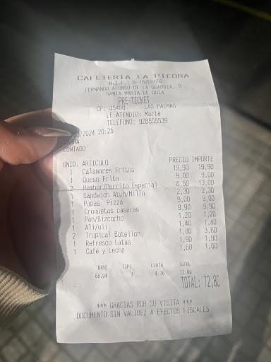 Read moreSitio muy pequeño, no pongo 0 estrellas porque no se puede. Tendría que llamarse bar la pedrada. Carísimo. Un plato mitad de calamares y mitad de patatas fritas congeladas 19.90 euros es un robo. Un plato mitad de cerdo en adobo y mitad de patatas congeladas 14,50 euros otro robo. Un plato de patatas fritas congeladas con una salchicha Frankfurt a trozos 6,50 euros una pedrada. La comida no estaba mala pero la cantidad en relación a lo que cobran si que está mal para se un bar de barrio. No es una terraza con vistas al mar ni un restaurante con una bonita decoración. No lo aconsejo más que para...