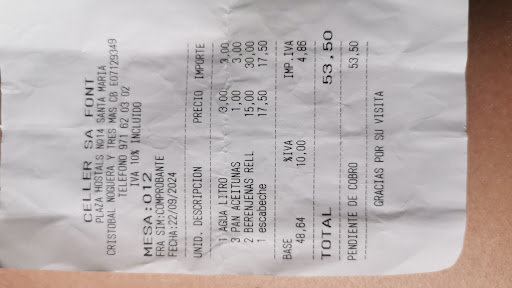 La comida cara y insípida. Servicio; llegamos hoy a las 12.50h, mesa al momento para tres personas, incluyendo silla que tuve que cambiar por otra de la misma mesa ya que me pegaba al respaldo, estaba algo mejor aunque sucedía lo mismo, mesa pringosa igual, eso sí sin aparente restos de comida anterior, con eso quiero decir que igual, esta claro que pasaron un trapo, aunque limpio no estaba. Continuamos... Llegó la comida a las 14h. Reclamé entremedias si había algún problema que no llegaba la comida, estoy esperando respuesta a mi pregunta todavía, eso sí cuando llamé al camarero, vino, escuchó mi demanda y se fue sin decir nada. Nos cobraron 1€ x persona por 6 trozos de pan diminutos y 11 aceitunas mallorquinas diminutas. Eso sí ni preguntan si las queremos o no, directamente las ponen en la mesa y clataclac!!! 3 € en la cuenta. Platos ; 2 de Berengenas rellenas, y 1 pescado en escabeche. Reclamé que un plato de berengenas tenía 2 pelillos en el plato, disculpas? Todavía espero. Se limitaron a limpiar con un trapo... Y a la mesa de nuevo. Berengenas malisimas una hasta amarga, patatas fritas frías y chiclosas Pescado seco de recalentado... Mucho que desear y eso que los dos platos era recomendaciones. No quiero saber el resto de platos. No pedimos entrates/aperitivo antes de los platos principales por el trato recibido al sentarnos en la mesa y yo comentar que me pegaba a la silla por el respaldo. Y decir que quería una botella de agua grande para tres aunque, porfavor, me trajera un poquito de hielo para mi que yo la quería fria. La cara del camarero a mi demanda... de foto y no agradable. Ambiente: estábamos justo delante de la salida platos de la cocina, había poca gente ya que llegamos pronto y era domingo y aún así no era agradable solo de ver las caras desagradables de los camareros al pasar pues no era un ambiente acogedor. Comimos y al retirar platos solicitamos la cuenta que fui a pagar a la barra, ni un céntimo más ni menos, justo lo que se solicitó. No entrantes, no refrescos, no allioli, no postres, no café... Por todo el servicio que recibimos desde el principio. Por educación y compromiso en la decisión al entrar allí a comer (hacia muchos años, que por circuntancias no lo hacíamos, ya que teníamos un buen recuerdo del lugar). Quisimos dar una oportunidad por el recuerdo que teníamos del celler. Decidimos esperar y comer. Aunque ganas no faltaron de levantarnos e irnos a cualquier otro lugar. UNA DECEPCIÓN EN GENERAL , NO RECOMIENDO NI REPETIRÉ Y TAMPOCO, POR SUPUESTO,...
