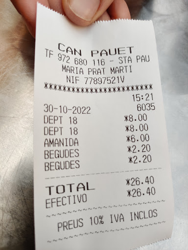Read moreSant Pau is a lovely little village 1 1/2 hours from Barcelona. It has a few restaurants one of which was Can Pauet. It has a nice location with a fantastic view of the walled village. The staff are very friendly and accommodating. The beer was cold, wine was lovely and the sausage with beans was fabulous. Highly recommended especially on a...