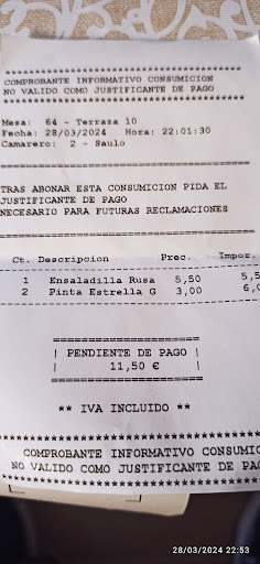 Última semana de octubre, muchos sitios cerrados, pasamos con el coche y al ver algunas mesas con gente en la terraza nos sentamos. Pedimos una caña, un tinto de verano, una ensaladilla y una ración de chorizo a la sidra. Al rato viene el camarero y me dice que si en lugar del chorizo podía ser magra con tomate. Aceptamos el cambio. La ensaladilla, pequeña para su precio, pero estaba buena. Sin embargo, el platito de la magra era muy pequeño, similar al de las tapitas que te ofrecen en algunos sitios con la bebida (en la foto se puede comparar su tamaño con respecto a la llave del coche). Con la cantidad de magra que tenía el plato no te haces ni medio bocadillo. Por un momento pensé que sería la tapa que dicen que te invitan con la cerveza (ver foto del cartel), que por cierto, ni me la ofrecieron (aunque en una reseña de Mónica de hace dos meses, el propietario le responde que con la caña sí pone algo), ni tampoco la exigí. Eso no es lo que me molestó. Por un lado, pusieron cuatro rodajas de pan duro. Comimos la magra sin el pan. Y lo peor, al pedir la cuenta me cobraron 5,50 por ese platito de magra, aunque el ticket marca chorizo a la sidra. El camarero dijo que el precio era el mismo, una cosa por otra. Me quejé al camarero del tamaño/precio y me dijo que no era un error, que eran los precios del bar. Otro detalle, en la foto de la carta que tienen en la fachada se ve mucha más cantidad de magra que la que me pusieron. En fin, primera y última vez que voy. No lo recomendaría.