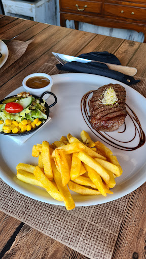 Very good atmosphere, perfect for days with good weather (5). The staff is very friendly and kind (5). We had the dishes of the day, baked salmon in filo pastry with pesto served with fries and salad (give it 4) and baked pork with mustard and camembert cheese served with fries and salad too (5). We also had the mix starter of croquetes, sausages and some kind of spring rolls (they were tasty) which personally we didnt like as it was deep fried, but that's just personal and sure other people would like it. Overall a recommended place to chill and...