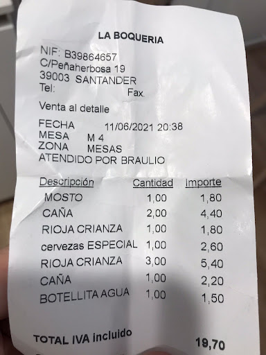Nos atendió un camarero muy amable. Según el ticket, un tal Braulio. Eso fue lo único bueno, porque luego apareció el amargado del “jefecillo” y tuvimos que marcharnos porque al pobre le molestaba que nuestros hijos estuvieran pintando con unas tizas EN LA CALLE, cerca de la puerta de entrada. Nos pidió, con la educación propia de un primate, que nuestros hijos dejaran de pintar. Como nosotros no queremos molestar a nadie y a educación no nos va a ganar este soplagaitas aspirante a tonto del año, pagamos religiosamente la abultada cuenta (en relación con las más que humildes consumiciones) y nos marchamos.