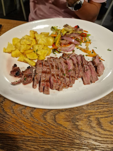 Soy un gran amante de la carne y tenía altas expectativas, ya que siempre que paso por el restaurante huele a parrilla y a leña, lo cual prometía buenas carnes. Sin embargo, me llevé una gran sorpresa al ver la carta: no había opciones de carne de vaca, únicamente solomillo, chuleta, entrecot y churrasco de ternera. Personalmente, encuentro la ternera poco sabrosa, por lo que decidí no pedir carne. Me parece una pena que, teniendo la parrilla que tienen, no ofrezcan carnes más variadas o de mayor calidad.