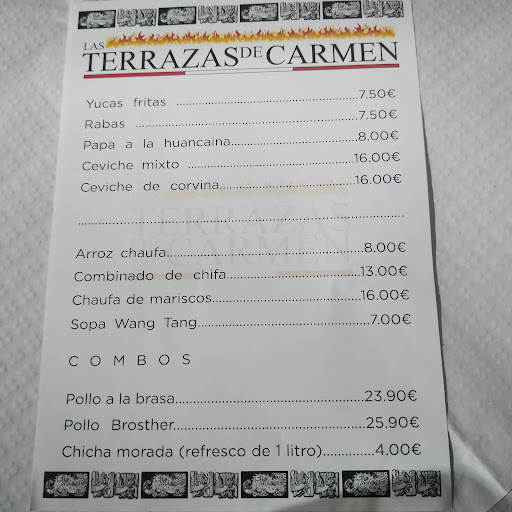 Read moreMi baja puntuación es por lo siguiente, éramos 3 personas y pedimos: yucas fritas , era una cestita con unos bastones de yuca acompañado de 3 salsas. = 9.90 € causa limeña, un aro de patata con 2 trocitos pequeños de aguacate y un langostino.= 10.90€ 1/2 pollo al carbón = que estaba bueno de sabor pero el interior estaba crudo, acompañada de muchiiisimas patatas y un platito de lechuga con 2 rodajas de pepino, tiras de zanahoria y 2 trozos de tomate= 17€ 1/4 pollo, pues como lo anterior descrito, pero todo junto en el mismo plato= 10€ costilla a la brasa, pues un trozo majo pero pues con poca carne y poco sabor, acompañada de más patatas= 18€ una copa de albariño =2.50€ 2 cervezas = a 3.50 € cada una 2 botellas de agua = a 3.20€ cada una el pan=0.80 1 ración tarta de limón = 4.90 € TOTAL 87.40 € 3 PERSONAS. Casi a 30 euros.(según ticket)