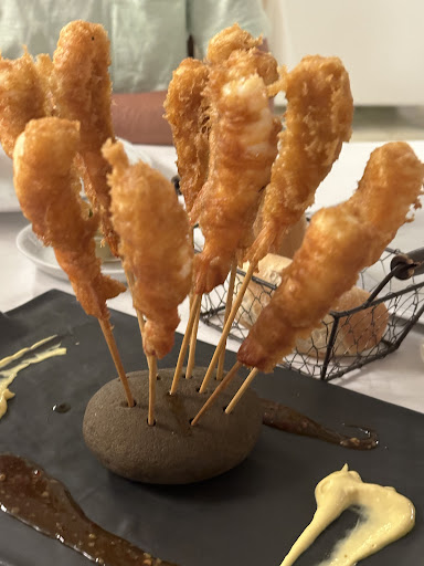 Restaurante buen servicio, buena cocina, empezamos con un aperitivo "pastel de setas" perfecta textura sabor intenso al producto primigenio que es a lo que por supuesto tiene que saber. Seguimos con unas zamburiñas parrilla 15€. 10 zamburiñas de buen tamaño perfectamente aderezadas. Gambas en tempura 12 unidades 15€ perfecto punto en el producto y exterior crujiente. Pulpo parrilla 19.50€ plato sin ningún pero al mismo Langostinos en salsa 6 unidades 14€ el plato que mas gusto en la mesa ejecución de 10. Rabo de toro en salsa al horno con queso 18€ se nota el trabajo en el mismo por su aspecto brillo dorado en el exterior y su textura melosa. Torrija de sobao pasiego con helado y pastel de zanahoria 6.50€ cada uno, postres riquisimos para un fin de una excelente comida. Vino Pago de Carraovejas año 2021 45€ Finalizamos con un café y una infusión. Excelente con muy buena cocina y excelente servicio en sala comandado por Ana que lidera la misma con una perfecta simbiosis con la cocina que lidera Fernando. Restaurante que tiene una RCP a reseñar muy buena. Totalmente recomendable para cántabros así como para...