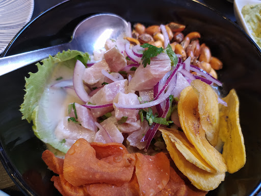 Tenía ganas de comer en este sitio para probar la fusión de comida mexicana y peruana. Entre semana tienen un menú degustación de 12 euros y los fines de semana de 14 euros, con la bebida aparte y el café. También tienen servicio a domicilio, que es lo que más les funciona, por eso no suele haber problema a la hora de encontrar una mesa para comer. La comida está rica, con relación al precio que pagas, pero en el caso de las costillas, aunque sea un menú degustación, te quedas un poco desencantada al recibir el plato con sólo 2 costillas y un montón de patatas fritas. Quizás debieran poner un plato más pequeño con las 2 costillas y menos patatas fritas, y quedaría mejor presentado, sin la sensación de que las costillas son ridículas en comparación a la cantidad de patatas fritas. Fuimos 5 personas a comer el menú degustación y con 2 jarras de sangría de litro, y 3 cafés que no entran en el menú, pagamos 89 euros. El postre que era brownie y tarta de 3 chocolates estaba bueno. En resumen, la relación calidad-precio es aceptable, pero no es comparable a un mexicano, donde también pagas mucho más por la comida, todo hay que decirlo. Lo mejor eso sí, es la atención del personal, muy amable y simpático y que es un sitio tranquilo y agradable para comer sin gastarse mucho dinero, por lo que en estos tiempos que en cualquier sitio que vas te meten una clavada por cualquier cosa, el Lyma es un sitio...