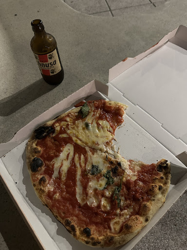 Excellent pizza and dough however one star lost because the pizza was not cut (I took away so this made it difficult to eat on the street) and for the distribution of cheese. Some parts of the pizza had none and were basically tomato on bread, while others had huge clumps, which meant chewing on them for a while just to swallow, felt like a choking hazard. Could have added more basil.