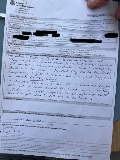 Really think twice about going here. Great location but service is the worse I have ever experienced. We ordered one of the paellas & when it arrived it was not the one we ordered. They tried to get us to have it anyway & told us we would have to wait another 20 minutes so we waited but asked for 2 complementary drinks totalling €9 so we would still have a drink with our meal. They refused & tried to make out everything was our fault. We asked for a complaint form that they begrudgingly gave us & I said I would not pay the full bill & they could call the Guardia Civil if they wanted & they did. After another 15 mins waiting we decided to pay the bill & leave anyway putting our trust in the complaint form process. I think the manager called the Guardia Civil to cancel but you would think considering they made a mistake they could have just given us a complementary drink to keep everyone happy? Clearly no concept whatsoever of customer service & the staff including manager are just really rude & dismissive, which is the experience of other guests who have left a review. I would definitely keep well away...