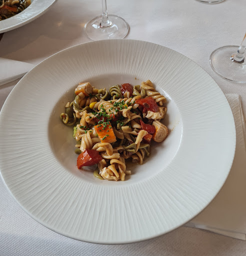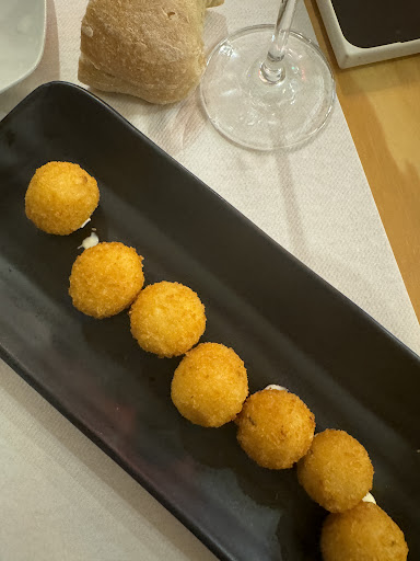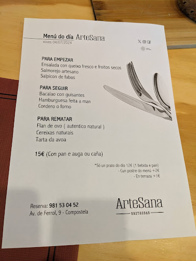 This was such a nice find for lunch near our hotel. The starters were amazing: Salmorejo and Salpicon de Fabas. Both with great acidity and so fresh, perfect for summer! For the mains, we chose Bacalao con Guisantes and Cordero o Forno. We both enjoyed our dishes. To finish, we had a flan that was delicious and as a healthier option, some cherries. The service was very friendly despite our lack of Spanish language skills. It was a wonderful experience and if we find ourselves back in Santiago, we'll definitely go back...