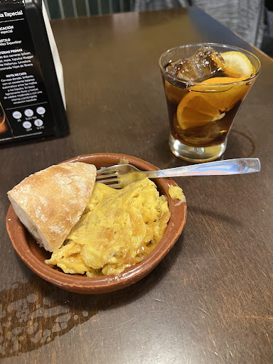 Read moreThis place was recommended by a tour guide. She said it was famous for its tortilla española (spanish potato omlette) which comes for free when you order a drink. She said that during the high season, the people line up down the street, so be careful. We showed up and went inside - we asked a waiter about getting a table and he said to go to the bar to put our names on the list. They will ask you if you want to sit inside, outside, or "egual" - we asked for a table inside because it was pretty chilly that day. As soon as we sat down and ordered our first drink, a vermouth, we were almost immediately served with a nice slice of tortilla with a little piece of bread in a little ceramic bowl. It was a good tortilla - it was made with caramelized onions, which is just how I like it. While it was great, I didn't feel like it was better than I had eaten elsewhere (I like the free one at Bar Caña Hueca better, and they have a great selection of vermouth to boot). Still, if you are hungry and on a budget, you could pop in here for a beer and satisfy your hunger for free. We saw one younger dude do just that - he came in solo, grabbed a beer, ate his tortilla and left. After the tapa, we wanted to try a couple of things. We ordered their fried calamari, which was served on a bed of french fries - that combination really worked. Their croquettes were amazing and basically as good as the ones we had tried at the Michelin starred Simpar (which won an award for best croquette in Spain). Highly recommend their croquettes - we got the jamon ones. Next we wanted to try something different and went with (I forget the name) breaded chicken cutlet which was pounded thin and friend that came with a salad. This wasn't anything unusual, but it was hearty. We finished our meal sharing a dessert. They had a coffee flan that day. One of them was more than big enough to share and it was also excellent. Overall good vermouth, good beer, good to great bar food and excellent dessert. Definitely worth a stop - just head to the front and put your name in. Then you can hang around outside until they come out and...